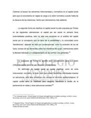 Coleman al buscar los elementos instrumentales y normativos en el capital social pero que al concretarlos en reglas se carga a la visión normativa cuando habla de la clausura de las relaciones, hecho que retomaremos más adelante. La segunda forma de clasificar el capital social ha sido expuesta por Portes en las siguientes valoraciones: el capital por ser social no siempre tiene externalidades positivas, éste ha sido una constante en el análisis del capital social por la concepción que se tiene de la sociabilidad y la comunidad como “bendiciones”, dejando de lado sus consecuencias, como la exclusión de los de fuera, exceso de las demandas sobre los miembros del grupo, restricciones sobre 24 la libertad individual y el adelgazamiento de las normas más generales. La propuesta de Portes es sencilla pero aleccionadora para una visión crítica del capital social en sus alcances y limitaciones: Su definición de capital social se puede clasificar como de corte instrumental- normativa, al tener claro que existen beneficios individuales insertos en estructuras, esta idea constituye una ventaja en términos epistemológicos. El capital social sería la “habilidad para asegurar beneficios a través de la 25 pertenencia en redes y otras estructuras sociales” 24 Ver Alejandro portes, “Social Capital: Its Origins and applications in modern sociology, en EricL. Lesser, Knowledge and social capital, Butterworth Heinemann, USA, 2000, p. 56. 25 Alejandro Portes, “Social Capital: Its Origins and applications in modern sociology, en EricL. Lesser, Knowledge and social capital, Butterworth Heinemann, USA, 2000, p. 50. Traducción libre del autor