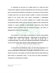 Lo interesante es que para él, el capital social es un medio que tiene consecuencias negativas o positivas dependiendo de los recursos que se emplean para la consecución de beneficios enmarcados en una estructura. Portes Presenta al capital social como una caja de entrada y salidas: A recursos consumatorios propios de las normas tales como valores introyectados y solidaridades emergentes en forma de fe comunal mediados por el capital social acarrea consecuencias desde nuestro punto de vista como negativas, tales consecuencias consisten en: acceso restringido a oportunidades; restricciones sobre libertad individual, reclamos excesivos sobre los miembros del grupo y, por último, un adelgazamiento de las normas generales. Si la entrada en la caja negra es alimentada por recursos instrumentales constituidos como intercambios recíprocos y reforzamiento de la confianza, las consecuencias saltan a la vista como positivas consistentes en: observancia de 26 normas (control social); apoyo familiar y redes mediadas por beneficios. La tercera forma de clasificación surge a raíz del artículo publicado por el socieconomista Mark S. Granovetter, “the strength of weak ties” en 1973. En este artículo el autor da un duro golpe a la visión del capital social de origen liberal que sobre estima la organización social y la vida cívica que había sorprendido a Tocqueville y su democracia en América. 26 Ibid., p. 50.