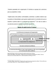 “Carácter apropiable de la organización. El individuo se apropia de la estructura para sus propósitos o metas. “Capital social y bien público: continuidades y asimetrías. Lo público reside en que no puede ser intercambiado, quien genera capital social no lo privatiza sino que se 31 expande a quienes están en la estructura de relaciones. Con esto se asiste a una derrama social en analogía a la derrama económica. Modelo de capital social en Coleman A B Elementos de Cohesión Elementos de Cohesión Elaboración Propia con base en la teoría del capital social de James Coleman Fuente: Réne Millán y Sara Gordon, “Capital social: una lectura de tres perspectivas clásicas”, Revista Mexicana de Sociología, México D.F., octubre-diciembre de 2004, pp.714-723. 31 En Réne Millán y Sara Gordon, “Capital social: una lectura de tres perspectivas clásicas”, Revista Mexicana de Sociología, México D.F., octubre-diciembre de 2004, pp. 717-721.
