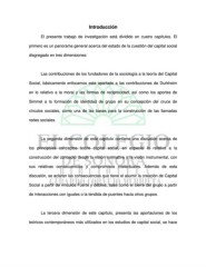 Introducción El presente trabajo de investigación está dividido en cuatro capítulos. El primero es un panorama general acerca del estado de la cuestión del capital social disgregado en tres dimensiones: Las contribuciones de los fundadores de la sociología a la teoría del Capital Social, básicamente enfocamos este apartado a las contribuciones de Durkheim en lo relativo a la moral y las formas de reciprocidad, así como los aportes de Simmel a la formación de identidad de grupo en su concepción del cruce de círculos sociales, como una de las bases para la construcción de las llamadas redes sociales. La segunda dimensión de este capítulo contiene una discusión acerca de los principales conceptos sobre capital social, en especial lo relativo a la construcción del concepto desde la visión normativa y la visión instrumental, con sus relativas consecuencias y compromisos intelectuales. Además de esta discusión, se aclaran las consecuencias que tiene el asumir la creación de Capital Social a partir de vínculos Fuerte y débiles, tales como el cierre del grupo a partir de interacciones con iguales o la tendida de puentes hacia otros grupos. La tercera dimensión de este capítulo, presenta las aportaciones de los teóricos contemporáneos más utilizados en los estudios de capital social, se hace