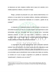 se desconoce; por tanto, traslada al público todo el peso de la decisión, de la medida suspensiva o dilatoria, o de asumir el riesgo. Riesgo y principio de precaución son, pues, factores determinantes en el contexto en el que actúan hoy los poderes públicos, urbanistas, planificadores y todas las personas y asociaciones implicadas en la creación y gestión de las 50 ciudades. La respuesta a la inseguridad siempre se había buscado y se busca en la comunidad de pares de ahí que en un mundo inseguro toma supremacía la socio territorialidad, pero esa comunidad cada vez se expresa como “comunidad realmente existente”, es decir, que exige lealtad y obediencia a cambio de seguridad y cada vez se descubre más la “comunidad imaginada” de solidaridad, refugio y defensa como deseo que siempre se ha tenido. La seguridad en las nuevas segregaciones, como “comunidad realmente existente” tiene sus beneficios y sus costos, porque para tener seguridad se cede a la libertad individual, para tener confianza se debe de desconfiar de los externos a la comunidad y para el entendimiento mutuo se debe evitar hablar con extraños. La moneda con la que se paga la seguridad es la pérdida de “autonomía”, 51 “autoafirmación” y “derecho a ser uno mismo”. 50 Francois Ascher, Los nuevos principios del urbanismo, Alianza editorial, Madrid España, 2004, P.69. 51 Zygmunt Bauman, Comunidad en busca de seguridad en un mundo Hostil, Siglo XXI, Madrid España, 2003, P. 7-12.