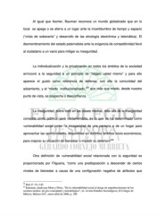 Al igual que Ascher, Bauman reconoce un mundo globalizado que en lo local se apega o se aferra a un lugar ante la incertidumbre de tiempo y espacio (“crisis de soberanía” y desarrollo de las etnología electrónica y telemática). El desmembramiento del estado paternalista ante la exigencia de competitividad llevó al ciudadano a un vacío para mitigar su inseguridad. La individualización y la privatización en todos los ámbitos de la sociedad arrinconó a la seguridad a un principio de “hágalo usted mismo” y para ello aparece el gueto como referencia de defensa, con ello la comunidad del 52 aislamiento, y el “miedo institucionalizado,” que más que miedo, desde nuestro punto de vista, es sospecha o desconfianza. La inseguridad, sobre todo en las clases medias, más allá de la inseguridad conocida como pública, pero conteniéndola, es lo que se ha denominado como vulnerabilidad social como “la incapacidad de una persona o de un hogar para aprovechar las oportunidades, disponibles en distintos ámbitos socio-económicos, 53 para mejorar su situación de bienestar o impedir su deterioro” Otra definición de vulnerabilidad social relacionada con la seguridad es proporcionada por Filgueira, “como una predisposición a descender de ciertos niveles de bienestar a causa de una configuración negativa de atributos que 52 Ibid. P. 131-145. 53 Katzman, citado por Mora y Pérez, “De la vulnerabilidad social al riesgo de empobrecimiento de los sectores medios: un giro conceptual y metodológico”, en revista Estudios Sociológicos, El Colegio de México, México D.F., enero-abril de 2006, p. 109.