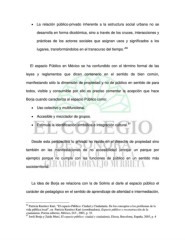 La relación público-privado inherente a la estructura social urbana no se desarrolla en forma dicotómica, sino a través de los cruces, interacciones y prácticas de los actores sociales que asignan usos y significados a los 56 lugares, transformándolos en el transcurso del tiempo.” El espacio Público en México se ha confundido con el término formal de las leyes y reglamentos que dicen contenerlo en el sentido de bien común, manifestando sólo la dimensión de propiedad y no de público en sentido de para todos, visible y consumible por ello es preciso comentar la acepción que hace Borja cuando caracteriza al espacio Público como: Uso colectivo y multifuncional. Accesible y mezclador de grupos. 57 Estimula la identificación simbólica e integración cultural. Desde esta perspectiva lo privado no reside en el derecho de propiedad sino también en las manifestaciones de no accesibilidad (enrejar un parque por ejemplo) porque no cumple con las funciones de público en un sentido más socioterritorial. La idea de Borja se relaciona con la de Solinis al darle al espacio público el carácter de pedagógico en el sentido de aprendizaje de alteridad e intermediación, 56 Patricia Ramírez Kuri, “El espacio Público: Ciudad y Ciudadanía. De los conceptos a los problemas de la vida pública local”, en Patricia Ramírez Kuri (coordinadora), Espacio público y reconstrucción de la ciudadanía, Porrua editores, México, D.F., 2003, p. 35. 57 Jordi Borja y Zaida Muxí, El espacio público: ciudad y ciudadanía, Electa, Barcelona, España, 2003, p. 4