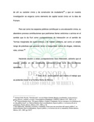 58 de ahí su carácter cívico y de constructor de ciudadanía y que en nuestra investigación se engarza como elemento de capital social cívico en la idea de Putnam. Pero así como los espacios públicos contribuyen a una educación cívica, su abandono provoca contribuciones que podríamos llamar anticívica o acívica en el sentido que le da Kuri como yuxtaposiciones de interacción en el sentido de “formas marginales de supervivencia y de habitar cotidiano, así como un amplio rango de prácticas que generan temor e inseguridad: trafico de drogas, violencia, 59 robo, crimen. Haciendo alusión a estas yuxtaposiciones Sara Makowski, advierte que el espacio público en las sociedades Latinoamericanas tiene dos tendencias opuestas: El aislamiento como debilitamiento de la sociabilidad y el registro de altos niveles de diferenciación que atenta con las posibilidades de 60 entendimiento ciudadano. Ésta es la preocupación que inspira el trabajo que se pretende iniciar el la frontera Norte de México. Enfoques interpretativos del caso de los espacios defensivos 58 German Solis Noyola, “Introducción”, en Luis Felipe Cabrales Barajas (coordinador), Latinoamérica: países abiertos, ciudades cerradas, Universidad de Guadalajara- UNESCO, México, D.F., 2002, p. 23. 59 59 38 Patricia Ramírez Kuri, “El espacio Público: Ciudad y Ciudadanía. De los conceptos a los problemas de la vida pública local”, en Patricia Ramírez Kuri (coordinadora), Espacio público y reconstrucción de la ciudadanía, Porrúa editores, México, D.F., 2003, p. 38. 60 Sara Makowski, Alteridad, exclusión y ciudadanía. Notas para una reescritura del espacio público”, en Patricia Ramírez Kuri (coordinadora), Espacio público y reconstrucción de la ciudadanía, Porrúa editores, México, D.F., 2003, pp. 96-97