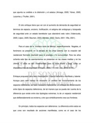 que apunta su análisis a la distinción y el estatus (Arizaga, 2005; Yánez, 2005; Lacarrieu y Thuiller, 2001). El otro enfoque tiene que ver con el aumento de demanda de seguridad en términos de espacio, encierro, fortificación, el estigma del endogrupo y búsqueda de seguridad ante un estado benefactor que abandonó este rubro (Valenzuela, 2005; López, 2005; Bauman, 2003; Méndez, 2002; Davis, 2001; Villa, 2001). Para el caso de la frontera norte de México, específicamente Nogales, el fenómeno se presentó en la década de los años setenta con la creación del residencial Kennedy diseñado para el prestigio y la exclusividad. Para los años ochenta este tipo de asentamientos se presentan en las clases medias y en los últimos 15 años se han incrementado para la clase media y baja, como un dispositivo más de seguridad (Enríquez, 2005: 111-143; Levi, 2005: 55-81). Enfoque propuesto para esta investigación: Espacio defensivo manifiesto y latente Aunque para este trabajo es necesario un análisis del funcionamiento de los espacios defensivos, se hace necesario implementar un enfoque de diferenciación entre tipos de espacios defensivos, de tal manera que se pueda dar cuenta de la diferencia que existe entre dos tipologías extremas, la de un espacio residencial que deliberadamente se encierra y otro que simbólicamente crea sus fronteras. En principio, todos los espacios son defensivos. La diferencia entre estos es que unos son resultado de acciones manifiestas, como es el caso de los