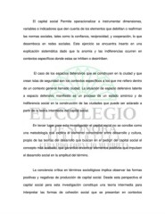 El capital social Permite operacionalizar e instrumentar dimensiones, variables e indicadores que den cuenta de los elementos que debilitan o reafirman las normas sociales, tales como la confianza, reciprocidad, y cooperación, lo que desemboca en redes sociales. Este ejercicio se encuentra inserto en una explicación sistemática dado que la anomia y las indiferencias ocurren en contextos específicos donde estas se inhiben o desinhiben. El caso de los espacios defensivos que se construyen en la ciudad y que crean islas de seguridad son los contextos específicos a los que me refiero dentro de un contexto general llamado ciudad. La situación de espacio defensivo latente a espacio defensivo manifiesto es un proceso de un estado amónico y de indiferencia social en la construcción de las ciudades que puede ser aclarado a partir de la teoría intermedia del capital social. En tercer lugar para esta investigación el capital social no se concibe como una metodología que explica el elemento consonante entre desarrollo y cultura, propio de las teorías del desarrollo que buscan en el pedigrí del capital social el concepto más acabado, que garantice encontrar elementos positivos que impulsen el desarrollo social en la amplitud del término. La conciencia crítica en términos sociológicos implica observar las formas positivas y negativas de producción de capital social. Desde esta perspectiva el capital social pera esta investigación constituye una teoría intermedia para interpretar las formas de cohesión social que se presentan en contextos