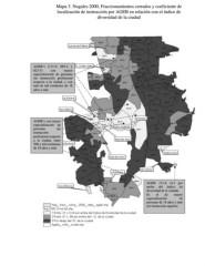 Mapa 3. Nogales 2000, Fraccionamientos cerrados y coeficiente de localización de instrucción por AGEB en relación con el índice de diversidad de la ciudad AGEB’s (111-9, 085-4 y 023-3) con mayor especialización de personas sin instrucción profesional respecto a la ciudad, y con más de mil residentes de 18 años y más AGEB’s con mayor especialización de personas sin instrucción profesional respecto a la ciudad, entre 500 y mil residentes de 18 años y más AGEB 131-6 (4.2 por arriba del índice de diversidad de la ciudad). Es el de mayor especialización de personas de 18 años y más sin instrucción superior.
