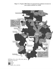 Mapa 4-A. Nogales 2000, Índice de segregación de residentes de menos de cinco salarios mínimos por AGEB AGEB’s con segregación media-baja (30-40%) por nivel de ingreso de más de 500 residentes en situación de ocupados. AGEB’s con segregación media-alta (40-50%) por nivel de ingreso de más de 500 residentes en situación de ocupados.