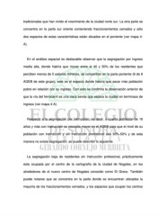 tradicionales que han vivido el crecimiento de la ciudad norte sur. La otra parte se concentra en la parte sur oriente conteniendo fraccionamientos cerrados y sólo dos espacios de estas características están situados en el poniente (ver mapa 4- A). En el análisis espacial es destacable observar que la segregación por ingreso media alta, donde habría que mover entre el 40 y 50% de los residentes que perciben menos de 5 salarios minimos, se concentran en la parte poniente (6 de 8 AGEB de este grupo), este es el espacio donde habría que sacar más población pobre en relación con su ingreso. Con esto se confirma la observación anterior de que la vía del ferrocarril es una clara senda que separa la ciudad en terminaos de ingreso (ver mapa 4-A). Respecto a la segregación por instrucción, es decir, a cuanta población de 18 años y más con instrucción se necesita mover en el AGEB para que el nivel de su población con instrucción y sin instrucción profesional sea 50%-50% y de esta manera no exista segregación, se puede describir lo siguiente: La segregación baja de residentes sin instrucción profesional, prácticamente esta ocupada por el centro de la cartografía de la ciudad de Nogales, en los alrededores de el nuevo centro de Nogales conocido como El Greco. También puede notarse que se concentra en la parte donde se encuentran ubicados la mayoría de los fraccionamientos cerrados, y los espacios que ocupan los centros