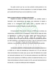 Se puede concluir que hay una clara asimetría oriente-poniente en los indicadores del estatus en términos espaciales en la ciudad de Nogales, dividido por la senda del ferrocarril que cruza la ciudad de sur a norte. Sobre el espacio defensivo manifiesto seleccionado Después de analizar los AGEB de acuerdo a las variables ingreso e instrucción, como representativas del estatus, para seleccionar el espacio a analizar en la investigación sobre capital social y seguridad urbana en fraccionamientos cerrados de Nogales, se puede afirmar que: El fraccionamiento Real del Arco reúne (en el AGEB que lo contiene), las características necesarias para la investigación. Aunque esta por abajo del índice de diversidad de la ciudad en el ingreso (0.59), tiene más de seis años funcionando, es de nivel medio, se ubica en un AGEB con una población ocupada de 1605 residentes y una población de 18 años y más con instrucción de 2616 residentes, lo que posibilita la localización de conjuntos habitacionales grandes. Además de lo anterior es un fraccionamiento que se encuentra contenido en un AGEB con un índice de diversidad por instrucción de 3.17% por arriba del índice de diversidad de la ciudad, asea, que por cada 100 habitantes de la ciudad con instrucción profesional, hay 317 sin instrucción profesional en ese AGEB. Este índice es sólo superado por el AGEB que contiene al residencial Kennedy, con un índice de diversidad por arriba de la ciudad de 3.9%, pero este fraccionamiento es de clase alta , no sujeto de análisis para esta investigación.