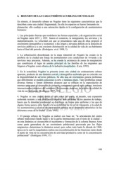 4. RESUMEN DE LAS CARACTERÍSTICAS URBANAS DE NOGALES En síntesis, el desarrollo urbano en Nogales tiene las siguientes características que la describen como una ciudad fragmentada. En ella los espacios se fueron formando sin planeación; ello condujo a una saturación rápida en la configuración de asentamientos humanos: 1. Las principales fuerzas que modelaron las formas espaciales y de organización social en Nogales entre 1853 y 1995 fueron el comercio, la inmigración, los servicios y la industrialización. La velocidad con que se presentaron cada una de ellas propició el crecimiento demográfico y económico y dio origen a elevados déficits en la dotación de servicios públicos y a una creciente disminución en la calidad de vida de sus habitantes hacia el final del periodo (Rodríguez et al. 1998, 3) 2. La urbanización desordenada en la etapa industrial de Nogales ha creado en la periferia de la ciudad una franja de asentamientos con condiciones de vivienda y de servicios muy precarias. Además, se ha creado la existencia de zonas de marginación que constituyen el lugar de asiento principal de las familias de los migrantes que llegaron a Nogales como obreros de la industria maquiladora (Lara, 1993). 3. En la actualidad, Nogales se presenta como una ciudad sin ordenamiento urbano aparente, producto de una dinámica social y demográfica acelerada que no coincide con la disponibilidad de servicios públicos. Su alta tasa de crecimiento genera problemas que difícilmente se pueden solucionar a corto o mediano plazo. Tales problemas toman diversas formas y tienen diferentes alcances que se reflejan en la especulación de terrenos aptos para el desarrollo de vivienda, competencia por el suelo urbano, tensiones internacionales (deterioro del ambiente). En resumen, deterioro de niveles de calidad de vida de sus habitantes (Rodríguez 1997, 19). 4. Nogales es una ciudad donde el alto valor del suelo, el tamaño, una expansión acelerada reciente y una distribución espacial más uniforme de los puestos de trabajo, hacen que la densidad residencial se distribuya en forma más uniforme y las que de alguna forma parece estar ligada a la accesibilidad de la red de transporte, a la edad de los asentamientos y al nivel de intervención pública en el desarrollo urbanístico de las diferentes zonas de la ciudad (Lara 1993). 5. El paisaje urbano de Nogales se realizó con base en: "la articulación del centro urbano tradicional (fundo legal) y de la garita internacional con el resto de la ciudad -- en esta dinámica se circunscribe el nacimiento y formación de la colonia Buenos Aires como parte generadora de un crecimiento poblacional provocada por los flujos migratorios--determinan la dinámica actual, pero sobre todo hasta la década de 1960, época en la cual la maquiladora realiza una reconformación de las funciones tanto desde el punto de vista de la concentración de actividad productiva como de la concentración poblacional" (Rodríguez 1999, 17) 108