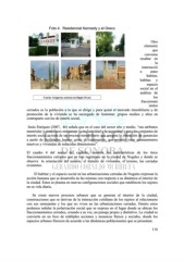 Foto 4. Residencial Kennedy y el Greco Otro elemento que conviene resaltar en la intersecció n entre habitar, habitus y espacio social en el análisis de Fuente: imágenes cortesía de Migde Wruck los fraccionam ientos cerrados es la población a la que se dirige y para quien el mercado inmobiliario y de promoción de la vivienda se ha encargado de fomentar: grupos medios y altos en contraparte con los de interés social. Jesús Enríquez (2007, 46) señala que en el caso del sector alto y medio, “sus atributos materiales y simbólicos endurecen la exclusividad y la seguridad y para los conjuntos de interés social se trata de un proceso inmobiliario que asegura la obtención de ganancias a partir de facilidades legales como el condominio, que permite crear asentamientos masivos y viviendas de reducidas dimensiones”. El cuadro 4 del anexo del capítulo, muestra las características de los trece fraccionamientos cerrados que se han registrado en la ciudad de Nogales y donde se observa la orientación del usuario, el número de viviendas, el terreno, las cerradas existentes. El habitar y el espacio social en las urbanizaciones cerradas de Nogales expresan la acción humana que se desarrolla en las mismas con respecto a su dinámica al interior de la ciudad. Estos se plasma en nuevas configuraciones sociales que establecen los sujetos en su vida diaria. Se crean nuevos procesos urbanos que se generan al interior de la ciudad, construcciones que se derivan de la interacción cotidiana de los sujetos al relacionarse con sus semejantes y los que no viven en las urbanizaciones cerradas. Dentro estos podemos señalar la polarización social que se expresa en el lugar donde se ubican los fraccionamientos cerrados, creando a su vez, un paisaje propio y distintivo. La ciudad se convierte en un foco de múltiples acciones y mosaicos físicos y sociales, donde los espacios urbanos florecen de acuerdo a las dinámicas poblacionales que se presentan. 116