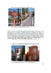 Foto 4. Accesos a Real del Arco y a Santa Lucía Fuente : Imágenes de Adolfo Ibarra y Ramón L. Moreno La foto 5 nos lleva a recorrer los caminos de Real del Arco y Santa Lucía por la composición de la vivienda, el símbolo del hogar, la integración del grupo y la personalidad, así como la convivencia de la familia. El espacio físico que se muestra en estas imágenes marca el proceso de promoción que se esperaba encontrar en cada uno de ellos. Ambas figuras son viviendas de dos plantas y se hallan situadas en lugares estratégicos del los fraccionamientos, por ejemplo las vialidades principales que identifican a cada uno de ellos y que se muestran en la foto 4. Foto 5. La vivienda en Real del Arco y Santa Lucía Fuente: Imágenes de Adolfo Ibarra y Ramón Leopoldo Moreno M. 146