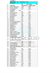 CUADRO 1 RELACIÓN DE COLONIAS DE NOGALES N0. DE TOTAL DE # COLONIA VIVIENDAS HABITANTES 1 NUEVO NOGALES 1600 9600 2 VILLA SONORA 1231 6158 3 FOVISSSTE 175 1050 JARDINES DEL 4 BOSQUE 960 4850 5 VILLA BONITA 109 436 6 EL RODEO 188 752 7 LOS ENCINOS 1000 5848 8 KENNEDY 370 2374 9 GRANJA 625 2500 10 KALITEA 113 469 11 RASTRO 200 1175 12 M. MAZA DE JUÁREZ 285 1211 13 LAS PRADERAS 81 486 14 LOS TÁPIROS 800 5895 15 OBRERA 650 4510 16 ESPERANZA 510 4473 17 BOLIVAR 680 3400 18 MODERNA 261 1656 19 CANOAS 592 1776 20 CHULA VISTA 520 2763 21 PROL. CHULA VISTA 420 2133 22 LOMAS DE FATIMA 1761 7044 23 DEL ROSARIO 820 4064 24 FUNDO LEGAL 2060 10297 LOMAS DE NOGALES 25 2 1200 6108 LOMAS DE NOGALES 26 1 420 2133 27 LOS ÁLAMOS 230 1144 28 LOS VIRREYES 530 2120 29 SOLIDARIDAD 1200 6000 30 EMPALME-NOGALES 260 1542 BELIZARIO 31 DOMÍNGUEZ 400 2050 32 5 DE MAYO 1100 5600 33 OAXACA 65 344 34 LEANDRO VALLE 415 2049 35 ZARAGOZA 330 1708 36 PUEBLO NUEVO 500 3060 37 BELLAVISTA 346 2093 38 ALTAMIRA 850 4356 39 DEL VALLE 356 2043 40 VERACRUZ 140 1102 41 ROSARITO 1 250 1537 42 PROL. DEL VALLE 210 1179 43 MUNICIPAL 1120 6908 44 ARTÍCULO 127 200 1075 45 PEÑALOZA 210 1281