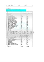 46 CTS-CROC 300 1560 CUADRO 1 RELACIÓN DE COLONIAS DE NOGALES NO DE TOTAL DE # COLONIA VIVIENDAS HABITANTES 47 HÉROES 800 5000 48 LOS SAUCES 282 1447 49 EMBARCADERO 1230 6229 50 BUENOS AIRES ESTE 490 3005 51 BUENOS AIRES OESTE 860 4285 52 BENITO JUÁREZ 350 2199 53 LÁZARO CARDENAS 120 761 54 COLONIA LAS TORRES 400 1600 55 COLINAS DEL YAQUI 200 800 56 FRACC. CALIFORNIA 75 375 57 COLINAS DEL LAGO 125 900 58 BOSQUES DE NOGALES 60 239 59 FRACC. JARDINES SOL 20 65 60 FRACC. REGIS 100 395 61 FOVISSSTE 2 210 930 62 PIMA 1 140 694 63 PIMA 2 360 2038 64 INFONAVIT 5 DE MAYO 610 3651 65 NUEVA DEL VALLE 250 1243 66 FRACC. EL POZO 60 251 67 BUENA VISTA 110 463 68 FRACC. LOS OLIVOS 130 633 69 VÁZQUEZ GUDIÑO 42 171 70 LAS HUERTAS 40 156 71 RANCHO CONTENTO 10 54 72 REAL DEL ARCO 44 190 73 ORIZABA 500 2550 74 ROSARITO 2 180 950 75 FRACC. SAN MIGUEL 12 48 76 FRACC PUESTA DEL SOL 400 1630 TOTAL 34853 184942