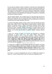 Por otra parte las prácticas, formas de entender la selección de un fraccionamiento cerrado, los discursos sobre el espacio donde se construye un habitar determinado, son parte de un proceso de construcción de un barrio ideal que ellos asumen como propio. Lejos quizá de la misma dinámica social que les impone la ciudad donde se inserta la vida cotidiana de los residentes, en esta orientación el habitar, sentido de la comunidad y quizá la formación de una identidad local corresponde a ese proceso de intervención que realizan los propios residentes. Idea que permite entender que el mundo social es en gran parte algo que hacen los agentes, a cada momento: pero solo pueden deshacerlo o rehacerlo sobre la base de un conocimiento realista de lo que es este mundo es y de lo que pueden hacer en función de la posición que en él ocupan. (Bourdieu 1990, 298). La conexión entre habitar, prácticas sociales y espacio social sería reforzado de acuerdo a Marc Augé ( 2004:134-125) “al lugar objetivo al espacio donde se inscriben marcas objetivas de identidad, relación e historia (monumentos funerarios, iglesias, lugares públicos, escuelas, etc.) y lugar simbólico a los modos de relación con el otro que prevalecen en aquél ( residencia, lenguaje, intercambios); no lugares objetivos son los espacios de tráfico, comunicación y consumo, y no lugares subjetivos son los modos de relación con el exterior que prevalecen en aquéllos: tránsitos, mensajes, anuncios, códigos”. A partir de lo anterior, el habitar es un proceso que desarrollan los individuos considerando el espacio donde viven: casa, ciudad, trabajo; donde realizan interacciones cotidianas en las que distintas posiciones y prácticas (habitus) se entretejen para canalizar los mecanismos propios de cada sujeto en el asentamiento urbano que habita y el grupo que lo rodea. Así por ejemplo, los roles como padre de familia, miembro de un comité de vecinos, trabajador de una empresa, miembro de una comunidad religiosa, entre otros, se pueden ilustrar las acciones que llevan a cabo en su convivencia personal y/o colectiva. La relación que se establece en un determinado lugar para vivir responde a las formas de vinculación que adopta el sujeto en ese espacio, su acción, formas de establecer relaciones, habilidad de integración al grupo, permanencia, y asumir los propios valores que lo identifican como ser humano: prácticas personales y colectivas, roles sociales, decisiones y posiciones ante las respuestas a los comportamientos que suceden en su medio. En la figura 1 se expresa la triangulación que existe en la realidad del ser humano en cuanto a su vivencia, el espacio que lo rodea y la acción que se desprende de ella. 26