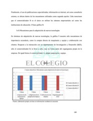 Finalmente, el uso de publicaciones especializadas, información en internet, así como consultoría externa, se ubican dentro de los mecanismos utilizados como segunda opción. Cabe mencionar que el comercializador B es el único en utilizar las cámaras empresariales así como las instituciones de educación. (Véase gráfica 8) b.4) Mecanismos para la adquisición de nuevas tecnologías En términos de adquisición de nuevas tecnologías, la gráfica 9 muestra sólo mecanismos de importancia secundaria, como la compra directa de maquinaria y equipo y colaboración con clientes. Respecto a la interacción con un departamento de Investigación y Desarrollo (I&D), sólo el comercializador B, la lleva a cabo, mas no forma parte del organigrama propio de la empresa. De igual forma el comercializador A, adapta maquinaria y equipo. Gráfica 9 Fuente: elaboración propia con base en información recabada de encuestas 109