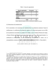 Tabla 1. Cursos de capacitación Tipo de capacitación Frecuencia % Higiene 8 38 52 Higiene y calidad 3 14 53 Higiene y sanidad 7 33 Producción, sanidad e 2 10 higiene Sanidad 1 5 Total 21 100 Fuente: elaboración propia con base en información recabada de encuestas b.2) Mecanismos de estandarización En lo concerniente a los mecanismos de estandarización, los productores mostraron 6 tipos de certificaciones. La certificación de producción orgánica es de observancia general, con un 100% de los productores encuestados; la sanidad e innocuidad, es decir, la Buenas Prácticas de Campo, y Buenas Prácticas de Manufactura tuvieron observancias de 57% y 14% respectivamente. La certificación de Bioterrorismo es sólo observada por un productor, lo mismo con la correspondiente a sistemas de riego y sanidad vegetal otorgada por SENSICA. (Véase tabla 2) 52 Son medidas aplicadas para garantizar la inocuidad, salubridad y valor intrínseco de los alimentos en todas las fases: cultivo, producción, preparación y consumo. Cuarto Informe del Comité de Expertos en Saneamiento del medio. (Salud 1956) (Salud 1956; Informe) 53 El concepto de calidad abarca una compleja gama de atributos que influyen en su valor o aceptabilidad para el consumidor. Estas características incluyen: el valor nutricional; las propiedades sensoriales, tales como la apariencia, color, aroma, textura y gusto; así como los métodos de elaboración y propiedades funcionales. Muchas de estas características consideradas de calidad pueden estar sujetas a condiciones regulatorias, normativas o contractuales. (Arispe et al. 2007) (Arispe and Tapia 2007) 123