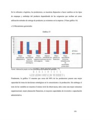 En lo referente a logística, los productores, se muestran dispuestos a hacer cambios en los tipos de empaque y embalaje del producto dependiendo de las exigencias que reciban así como utilización métodos de entrega de productos ya existentes en la empresa. (Véase gráfica 14) c.3) Mecanismos gerenciales Gráfica 15 Fuente: elaboración propia con base en información recabada de encuestas Finalmente, la gráfica 15 muestra que cerca del 80% de los productores poseen una mejor capacidad de toma de decisiones estratégicas en lo concerniente a la producción. Sin embargo el resto de las variables no muestra el mismo nivel de observancia, tales como una mejor estructura organizacional, mejor planeación financiera, ni mayores capacidades de inversión o capacitación administrativa. 131