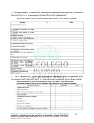 22. De la siguiente lista ¿Cuáles son las actividades de aprendizaje que utilizan para incrementar el conocimiento en su empresa y para compartirlo entre los trabajadores? De las opciones señaladas, ¿cuáles son las 3 más importantes? Ordene iniciando con 3 en la actividad más importante. ACTIVDAD SI ORDEN 1) Capacitación de su personal 2) Contratación de personal con mayor experiencia 3) Reuniones para compartir y analizar experiencias 4) Ingeniería de reversa 5) Adaptación de la maquinaria/equipo 6) Asistencia a eventos o ferias empresariales 7) Colaboración con proveedores 8) Investigación de tendencias de mercado 9) Colaboración con clientes 10) Colaboración con universidades o centros de investigación 11) Colaboración con otras empresas del sector 12) Documentación de procesos 13) Esquema de maestro-aprendiz (padrino) 14) Asesoría externa (de clientes o proveedores) 15) Asistencia técnica (de clientes o proveedores) 16) Uso de manuales 17) Visitas a otras empresas 18) Introducción de certificaciones 19) Otros ¿Cuáles? 23. De la siguiente lista ¿Cuáles son las fuentes de información para el aprendizaje en la empresa durante los últimos 5 años? Ver cuadro 1 para el concepto de fuentes de aprendizaje Indique la localización de las fuentes: 1=en la localidad; 2=en el país; 3=en el exterior 99=No sabe/No contestó De las opciones señaladas, ¿cuáles son las 3 más importantes? Ordene iniciando con 3 en la actividad más importante. Descripción de la fuente Si Localización Orden 1) Departamento de I&D 2) Área de producción 3) Área de ventas, mercadotecnia y servicio al cliente 4) Empresas aliadas 5) Proveedores de equipos y materiales 6) Clientes 7) Competidores 8) Empresas de consultoría 9) Instituciones de Educación 10) Centros públicos de investigación y desarrollo tecnológico La formulación de la encuesta tomó como punto de partida el cuestionario usado en el proyecto “Redes globales 147 de producción y aprendizaje local. Derrama tecnológica de las transnacionales y capacidad de absorción en pymes de base tecnológica en el noroeste de México”. El proyecto pertenece a El Colegio de Sonora y se encuentra bajo la dirección del Dr. Oscar Contreras.