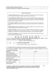 15) Mayor habilidad para adaptación de equipos 16) Mayor capacidad para hacer investigación y desarrollo tecnológico Cuadro 2. Tipos de innovación Un producto o servicio nuevo puede ser nuevo para su empresa o para el mercado y cuyas características tecnológicas o uso difieren significativamente de todos los productos que su empresa produce actualmente. Una mejora significativa de producto o servicio se refiere a un producto previamente existente, cuyo desempeño fue sustancialmente aumentado. Un producto complejo que consiste de varios componentes o subsistemas integrados, puede ser perfeccionado por cambios parciales en alguno de sus componentes o subsistemas. Los cambios que son básicamente estéticos o de estilo, no deben ser considerados. Nuevos procesos de producción son procesos nuevos para su empresa o para el sector. Involucran la introducción de nuevos métodos, procedimientos, sistemas, maquinaria y equipo que difieren sustancialmente de los utilizados por su empresa. Mejoras significativas a los procesos de producción involucran cambios tecnológicos importantes y parciales en procesos ya usados. Cambios pequeños y de rutina no deben ser considerados. Innovación organizacional implica cambios en formas de organización y gestión del establecimiento; cambios en la organización y administración del proceso productivo, incorporación de estructuras organizativas modificadas significativamente e implementación de orientaciones estratégicas corporativas nuevas o sustancialmente modificadas. Innovación en comercialización, consiste en la comercialización de nuevos productos. Nuevos métodos de entrega de productos. Cambios en el empaque y embalaje. 26. ¿Esta empresa ha realizado innovaciones de producto o proceso? Ver cuadro 2 como auxiliar para identificar el tipo de innovación introducido. Si No (Pase a la pregunta #35) 27. ¿Cuáles fueron las principales motivaciones para desarrollar nuevos productos/procesos? De las opciones señaladas, ¿cuáles son las 3 más importantes? Ordene iniciando con 3 en la actividad más importante. Motivación Si Orden 1) Por iniciativa propia 2) Por solicitud de un cliente 3)Sugerencia de un proveedor 4) Proyectos compartidos con otras empresas del sector 5)Por imitación de la competencia 6) Proyecto compartido con instituciones de educación 7) Otros ¿Cuáles? La formulación de la encuesta tomó como punto de partida el cuestionario usado en el proyecto “Redes globales 149 de producción y aprendizaje local. Derrama tecnológica de las transnacionales y capacidad de absorción en pymes de base tecnológica en el noroeste de México”. El proyecto pertenece a El Colegio de Sonora y se encuentra bajo la dirección del Dr. Oscar Contreras.