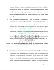 los agentes fabricantes y son ellos los que posteriormente, se convierten en vendedores. Sin embargo, este punto no está ausente en las RGP impulsadas por el productor, ya que son ellos los que determinan que se producirá, con base en investigaciones de mercado así como su capacidad tecnológica para diseñar productos que creen novedad en los consumidores. II. Cómo será producido: este punto refleja el poder de decisiones a nivel gerencial, especialmente en lo pertinente a la organización de la producción y la elección de la tecnología. Tales decisiones no sólo reflejan los objetivos económicos como el incremento en la productividad, eficiencia y maximización de los beneficios. Estos servicios de alto valor están, especialmente basados en conocimiento científico e incluyen los aspectos de investigación y desarrollo, tecnología e innovación, muy característicos de los segmentos o nodos de las redes impulsadas por los productores. Por lo tanto, son ellos los que tienen la capacidad de crear un efecto de transformación continua de los procesos de producción no solo en los nichos centrales sino también en el resto de la red. Además de los puntos anteriores, donde ambos agentes que impulsan las redes globales (productor y comprador) están interrelacionados, existen aun tres aspectos III. Transporte y telecomunicaciones: son servicios claramente indispensables, importantes y críticos para los flujos transnacionales para la producción global. Son los que movilizan los productos así como información, componentes y personal entre los nodos las redes globales. Los servicios de transportación han tenido un lugar dominante en el sector servicios y por ende un elemento incorporado en la producción. En el caso de Compañías 21