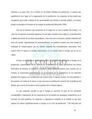 referente a la mano obra. En el ámbito de las Redes Globales de producción, el cambio más significativo tuvo lugar en la organización de la producción. Las empresas se han tenido que reorganizar para tomar ventajas de las oportunidades que brinda el mercado global, y al mismo tiempo se protegen así mismas de los riesgos de producción (Reynolds 1994). Uno de los pioneros que incursionó en el origen de un nuevo sentido del tiempo y su valor fue la industria automotriz japonesa, la cual sigue teniendo como objetivo, la proliferación y rápida renovación de las líneas de productos. Ante este nuevo escenario, muchas industrias del resto del mundo, especialmente las norteamericanas, no pudieron sostener por más tiempo la estrategia de tiempo-espacio que en muchos aspectos fue tremendamente innovadora. Este control sobre el espacio se anclaba, básicamente, en un control sobre el tiempo, que ya no era válido. Si bien, en el estudio de Schoenberg (1994), la habilidad de administrar el tiempo en la producción, características de las técnicas de la producción en masa, permitieron una forma innovadora de dominar el espacio y con ello el factor distancia parecía estar resuelto por el sistema; la consecuente transformación en la naturaleza de la competencia en los mercados globales hizo urgente una recalibración del control sobre el espacio tiempo. En otras palabras y de acuerdo a la visión de la autora, lo que esta nueva recalibración resolvió fue el problema del tiempo, que a través de los años volvió a generar otro: el factor espacio. Lo que realmente sucedió es que el tiempo se convirtió en parte de los elementos considerables e importantes de los corporativos en la creación de estrategias competitivas en el mercado. En otras palabras, las empresas o corporativos compiten en la medida en que sean capaces de reducir significativamente el tiempo en su ciclo de producción. “The firm that can 24