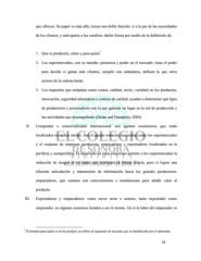 que ofrecen. Su papel va más allá, tienen una doble función: ir a la par de las necesidades de los clientes, y anticiparse a los cambios, darles forma por medio de la definición de: 7 1. Qué se producirá, cómo y para quién 2. Los supermercados, con su tamaño, presencia y poder en el mercado, tiene el poder para decidir si ganan más clientes, cumplir con estándares, definen lo que otros actores de la cadena harán. 3. Los requisitos que estipulan como costos, calidad, envío, variedad en los productos, innovación, seguridad alimentaria y sistema de calidad, ayudan a determinar qué tipos de productores y procesadores son lo que ganaran un lugar en la red de producción y las actividades que desempeñarán (Dolan and Humphrey 2004). II. Comprador o comercializador internacional: son agentes económicos que están localizados en nichos núcleo. Son el puente entre los minoristas como los supermercados y el conjunto de empresas productora, empacadores y exportadores localizados en la periferia y semiperiferia. El desarrollo de estas relaciones permite a los supermercados la reducción de riesgos al no tratar con productos de forma directa, pero sí lograr una eficiente articulación y transmisión de información hacia los grandes productores, empacadores, que cuentan con conocimientos e instalaciones para añadir valor al producto. III. Exportadores y empacadores: como tercer actor o actores, tanto exportador como empacador, en algunas ocasiones tienden a ser el mismo. En sí la labor del empacador es 7 El término para quién se ha de producir se refiere al segmento de mercado que es identificado por el minorista. 33