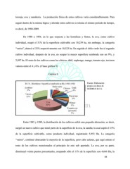 toronja, uva y zanahoria. La producción física de estos cultivos varía considerablemente. Para seguir dentro de la misma lógica y abordar estos cultivos se retoma el mismo periodo de tiempo, es decir, de 1980-2009. De 1980 a 1984, en lo que respecta a las hortalizas y frutos, la uva, como cultivo individual, ocupó el 31% de la superficie cultivable con 10,259 ha, sin embargo, la categoría “varios”, abarcó el 32% respectivamente con 10,523 ha. En seguida el chile verde fue el segundo cultivo individual, después de la uva, en ocupar la mayor superficie sembrada con un 9%, y 2,997 ha. El resto de los cultivos como los cítricos, dátil, espárrago, mango, tomate rojo, tuvieron valores entre el 4 y 6%. (Véase gráfica 9) Gráfica 9 Fuente: Elaboración propia con datos de OEIDRUS B.C.S. Entre 1985 y 1989, la distribución de los cultivos sufrió una pequeña alteración, es decir, surgió un nuevo cultivo que tomó parte de la superficie de la uva, la sandía; la cual captó el 15% de la superficie cultivable, como producto individual, registrando 5,953 Ha. La categoría “varios”, continuó abarcando la mayoría de la superficie, pero cabe aclarar, que aquí entran el resto de los cultivos mencionados al principio de este sub apartado. La uva, por su parte, disminuyó veinte puntos porcentuales, ocupando sólo el 11% de la superficie con 4,666 Ha; la 64