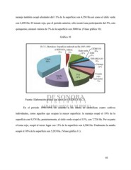 naranja también ocupó alrededor del 11% de la superficie con 4,350 Ha así como el chile verde con 4,690 Ha. El tomate rojo, que el periodo anterior, sólo mostró una participación del 5%, este quinquenio, alcanzó valores de 7% de la superficie con 3000 ha. (Véase gráfica 10). Gráfica 10 Fuente: Elaboración propia con datos de OEIDRUS B.C.S. En el periodo 1990-1994, de acuerdo a los datos, se identifican cuatro cultivos individuales, como aquellos que ocupan la mayor superficie: la naranja ocupó el 19% de la superficie con 9,574 Ha, posteriormente, el chile verde ocupó el 15%, con 7,726 Ha. Por su parte el toma rojo, ocupó el tercer lugar con 13% de la superficie con 6,500 Ha. Finalmente la sandía ocupó el 10% de la superficie con 5,283 Ha. (Véase gráfica 11). 65