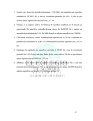 1. Tomate rojo: dentro del periodo referenciado (1999-2008), ha registrado una superficie sembrada de 28,706.85 Ha y tasa de crecimiento promedio de 6.6%. El año en que alcanzó mayor superficie fue en 2007 con 3,457 Ha. 2. Naranja: es el segundo cultivo en términos de superficie sembrada en el periodo ya mencionado. Su superficie sembrada alcanza valores de 22,603.95 Ha y registra un promedio de crecimiento de 2.6%. En 2008 alcanzó su máxima superficie con 2,540 Ha. 3. Chile verde: es el tercer cultivo; ha sumado una superficie de 18,756 Ha y registrado un promedio de crecimiento de 6.24%. En 2004 alcanzó la máxima superficie con 2,261.75 Ha. 4. Espárrago: ha registrado una superficie sembrada de 15,407 Ha y tasa de crecimiento promedio de 2.3%, la tasa más baja dentro de los cinco cultivos. El año en que alcanzó mayor superficie fue en 2001 con 1,679 Ha. 5. Albahaca: es el último cultivo; registró una superficie de 4,254.25 Ha y una tasa promedio de crecimiento de 21.55%, la más alta dentro de este grupo. En 2003 alcanzó la máxima superficie con tan sólo 810 Ha (Véase gráfica 13). 67