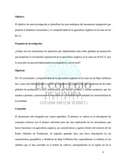 Objetivo El objetivo de esta investigación es identificar los ejes medulares del mecanismo integración que propicia el dinámico crecimiento y la competitividad de la agricultura orgánica en la zona sur de B.C.S. Pregunta de investigación ¿Cuáles son los mecanismos de operación que implementan estas redes globales de producción que propician el crecimiento exponencial de la agricultura orgánica en la zona sur de B.C.S. que la convierte en una actividad productiva competitiva a nivel local? Hipótesis H1: El crecimiento y competitividad de la agricultura orgánica en la zona sur de Baja california Sur, como actividad productiva se debe al mecanismo de integración entre empresas de las redes globales de producción a nivel internacional que buscan producir y transar productos que los ayuden a penetrar y posicionarse en mercados en crecimiento aprovechando las características de la localidad. Contenido El documento está integrado por cuatro apartados. El primero se enfoca en la descripción de conceptos teóricos con el alcance suficiente para dar una explicación de los mecanismos que hacen funcionar a la agricultura orgánica, sus características y agentes dentro del contexto de las Redes Globales de Producción. El segundo apartado hace una breve descripción de las características geográficas y climáticas de Baja California Sur; espacialmente se enfatiza en los cambios que se han suscitado en el patrón de cultivos, principalmente en la región sur de la 6