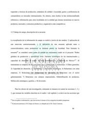 responder a técnicas de producción, estándares de calidad e inocuidad, gustos y preferencias de consumidores en mercados internacionales. En síntesis, estos hechos la han institucionalizado referencia e información para otras localidades de la entidad que desean incursionar en nuevos productos, mercados y estructura productiva y organizativa más competitivos. 3.2 Trabajo de campo, descripción de la encuesta La recopilación de la información de campo se realizó a través de dos medios: 1) aplicación de una entrevista semiestructurada, y 2) aplicación de una encuesta aplicada tanto a comercializadores como productores en distintos puntos de localidad. Para formular la 26 encuesta se consideró como punto de partida un cuestionario usado en el proyecto “Redes globales de producción y aprendizaje local. Derrama tecnológica de las transnacionales y 27 capacidad de absorción en pymes de base tecnológica en el noroeste de México” . El instrumento se compone de diez secciones que a continuación se mencionan: 1) Datos generales, 2) Capacidad de absorción, 3) Aprendizaje e innovación tecnológica, 4) Relaciones con otras empresas, 5) Relaciones con instituciones de educación, 6) Relaciones con el sector gubernamental, 7) Relaciones con cámaras empresariales, 8)Identificación de productos, 9)Dirección estratégica y gestión, y 10) Inversión. Para los efectos de esta investigación, solamente se tomaron en cuenta las secciones 1, 2 y 3, que retoman las variables descritas en el cuadro 1 del capítulo I, es decir son las secciones que 26 Para recopilar la información y que ésta tuviera el alcance de las categorías de análisis propuestas. 27 El proyecto pertenece a El Colegio de Sonora y es dirigido por el Dr. Oscar Contreras. 80