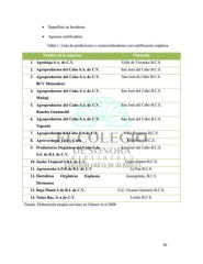 Superficie en hectáreas Agencia certificadora Tabla 1. Lista de productores y comercializadores con certificación orgánica Nombre de la empresa Ubicación 1. Agrobaja S.A. de C.V. Valle de Vizcaíno B.C.S. 2. Agroproductos del Cabo S.A. de C.V. San José del Cabo B.C.S. 3. Agroproductos del Cabo S.A de C.V. San José de Cabo B.C.S. BCV Maneadero 4. Agroproductos del Cabo S.A de C.V. San José del Cabo B.C.S. Mulegé 5. Agroproductos del Cabo S.A de C.V. San José del Cabo B.C.S. Rancho Guamuchil 6. Agroproductos del Cabo S.A de C.V. San José del Cabo B.C.S. Tepentú 7. Agroproductos del Cabo S.A de C.V. Villa Zaragoza B.C.S. 8. Agroverdugo/ Tick y Cabo Miraflores B.C.S. 9. Productores Orgánicos del Cabo S de San José del Cabo B.C.S. S.S. de R.L de C.V. 10. Sueño Tropical S.R.L de C.V. Todos Santos B.C.S. 11. Agroeureka S.P.R de R.L de C.V La Paz B.C.S. 12. Hortalizas Orgánicas Espinoza Insurgentes, B.C.S Hermanos 13. Baja Plants S de R.L de C.V. Col. Vicente Guerrero B.C.S. 14. Natra Bay, S.A de C.V. Loreto B.C.S. Fuente: Elaboración propia con base en Gómez et al 2008 (Gómez et al. 2008) 85