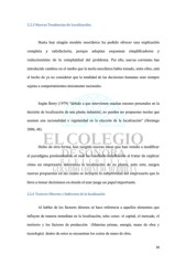 2.2.3 Nuevas Tendencias de Localización. Hasta hoy ningún modelo neoclásico ha podido ofrecer una explicación completa y satisfactoria, porque adoptan esquemas simplificadores y reduccionistas de la complejidad del problema. Por ello, nuevas corrientes han introducido cambios en el rumbo que la teoría neoclásica había tomado, entre ellos, está el hecho de ya no considerar que la totalidad de las decisiones humanas sean siempre sujetas a comportamientos únicamente racionales. Según Berry (1979) “debido a que intervienen muchas razones personales en la decisión de localización de una planta industrial, no pueden ser propuestas teorías que asumen una racionalidad o regularidad en la elección de la localización” (Hormigo 2006, 48). Dicho de otra forma, han surgido nuevas ideas que han venido a modificar el paradigma predominante, el cual ha resultado insuficiente al tratar de explicar cómo un empresario determina la localización de su planta, ante esto, surgen nuevas propuestas en las cuales se incluyen la subjetividad del empresario que lo lleva a tomar decisiones en donde el azar juega un papel importante. 2.2.4 Factores Directos e Indirectos de la localización Al hablar de los factores directos sé hace referencia a aquellos elementos que influyen de manera inmediata en la localización, tales como: el capital, el mercado, el territorio y los factores de producción (Materias primas, energía, mano de obra y tecnología) dentro de estos se encuentran los costes de mano de obra. 30