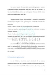 Los costos de mano de obra es uno de los factores más importantes al momento de decidir la localización de la actividad, punto que se vuelve aún más delicado si se trata de actividad industrial, debido a que existen grandes diferencias salariales de una región a otra, aún dentro de un mismo país. De manera resumida, el efecto salarial para atraer la localización o relocalización industrial se puede simplificar en los siguientes puntos, considerando también lo antes mencionado: • Cuando la oferta de mano de obra crece más rápidamente que la demanda. • Cuando las operaciones económicas para la mano de obra local residen en regiones industriales deprimidas. • Cuando el empleo existente se dirige a una parte de la población. • Donde el coste de la vida es bajo, y por ello los salarios reales son más elevados que los salarios pagados (Hormigo 2006. 53,54). Los factores indirectos de la localización son aquellos que aportan economías a escala y de aglomeración, en otras palabras, induce a economías de localización, las cuales surgen de la concentración de fábricas de actividad similar en un área geográfica muy restringida. 2.3 Economías de aglomeración Son las ciudades el área óptima para la localización de las empresas manufacturera debido a que aquí se generan las llamadas “economías de aglomeración” debido a la concentración espacial de la actividad económica, las ventajas que estas 31