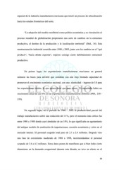 espacial de la industria manufacturera mexicana que inició un proceso de relocalización hacia los estados fronterizos del norte. “La adopción del modelo neoliberal como política económica y su vinculación al proceso mundial de globalización propiciaron una serie de cambios en la estructura productiva, el destino de la producción y la localización territorial” (Ibíd., 14). Esta reestructuración industrial ocurrida entre 1980 y 2003, junto con los cambios en el “qué producir”, “hacia dónde exportar”, trajeron consigo cierto debilitamiento estructural productivo. En primer lugar, las exportaciones manufactureras mexicanas en general sentaron las bases para advertir que contaban con una muy limitada capacidad de promover el crecimiento económico nacional, con una elasticidad – ingreso de 5.8 para las exportaciones totales, lo que quiere decir que para crecer 1% necesitaba haber un crecimiento anual de casi 6% en las exportaciones manufactureras (Sobrino 2006, 258 - 259). En segundo lugar, en el período de 1980 – 2003 la productividad parcial del trabajo manufacturero sufrió una reducción del 11%, pero el momento más crítico fue entre 1980 y 1988 donde cayó alrededor de un 18%, lo que significaba un agotamiento del antiguo modelo de sustitución de importaciones, recesión económica y crisis en el mercado interno. El personal ocupado total paso de 2.1 a 2.6 millones. Después vino una fase de crecimiento moderado de 1988 a 1998, incrementándose el personal ocupado de 2.6 a 4.2 millones. Estos datos ponen de manifiesto que si bien hubo cierto dinamismo en la demanda ocupacional durante esta década, no tuvo un efecto en el 39