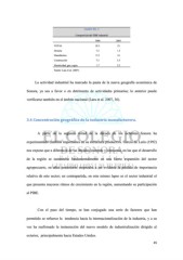 Cuadro No. 1 Composición del PIBE industrial 1980 2003 TOTAL 28.3 23 Minería 7.2 1.3 Manufactura 12.1 16 Construcción 7.3 3.5 Electricidad, gas y agua 1.7 2.2 Fuente: Lara et al. (2007). La actividad industrial ha marcado la pauta de la nueva geografía económica de Sonora, ya sea a favor o en detrimento de actividades primarias; lo anterior puede verificarse también en el ámbito nacional (Lara et al. 2007, 36). 3.4 Concentración geográfica de la industria manufacturera. A partir de la segunda mitad de la década de los ochentas Sonora ha experimentado cambios importantes en su estructura productiva. García de León (1992) nos expone que a diferencia de las décadas cuarenta y cincuenta, en las que el desarrollo de la región se sustentaba fundamentalmente en una fuerte expansión del sector agropecuario, en años posteriores empezaba a ser evidente la pérdida de importancia relativa de este sector; en contrapartida, en este mismo lapso es el sector industrial el que presenta mayores ritmos de crecimiento en la región, aumentando su participación al PIBE. Con el paso del tiempo, se han conjugado una serie de factores que han permitido se refuerce la tendencia hacia la internacionalización de la industria, y a su vez ha reafirmado la instauración del nuevo modelo de industrialización dirigido al exterior, principalmente hacia Estados Unidos. 45