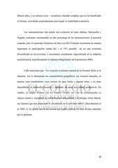 últimos años, y un entorno socio – económico mundial complejo que no ha beneficiado al turismo, actividades preponderantes para lograr su estabilidad económica. Las remuneraciones han tenido una evolución un tanto distinta, Hermosillo y Nogales continúan concentrando un alto porcentaje de las remuneraciones al personal ocupado, pero el municipio fronterizo de San Luis Río Colorado incrementa de manera importante su participación estatal del 1 al 15% pasando de ser una economía diversificada en los noventas, a encontrarse actualmente especializada en la industria manufacturera, específicamente la Industria Maquiladora de Exportación (IME). Cabe mencionar que “La vocación económica natural de la Frontera Norte es la industria. Así lo determinan sus características geográficas, sus recursos naturales, su enorme zona semidesértica cuya escasez de agua limita a algunas áreas, y en otras imposibilita, el desarrollo racional y ordenado de otras actividades productivas. En cambio, su amplia frontera con los Estados Unidos, sus vías de comunicación, su riqueza minera y energética, su infraestructura educacional y su benigno clima laboral, son factores que han propiciado el crecimiento de la actividad fabril” (Díaz-Bautista et al. 2002, 2). Es quizás una de las razones que podría explicar los altos niveles salariales que se presenta. 48
