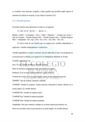 se considero como personas ocupadas a todas aquellas que percibían algún ingreso al momento de realizar la encuesta, lo que redujo la muestra a 631. 4.1.2 El modelo aplicado. El modelo tentativo para determinar el salario es el siguiente: Yi = β0 + β1 Xi + β2 X2 +… +βn Xn + e i Modelo: LnING = (Constante) + Sexo + Edad + Sindicato + Contrato por escrito + Tipo de Contrato + Tamaño Empresa Mic + Tamaño Empresa Peq. + Tamaño Empresa Med + Antigüedad + Sec. Agri. y Pes + Sec. Com. + Sec. Man. + Sec. Ser. El cual se trata de una función que se compone por variables dependientes o explicada y variables independientes o explicativas. Variable dependiente es ingreso mensual: esta fue elaborada en base a las preguntas de la encuesta que se referían a los ingresos de los trabajadores obtenidos en 30 días. Variables explicativas son: Sexo: Es una variable dicotómica, Hombre o Mujer. Edad: Se formaron categorías de edad, para facilitar el análisis. Sindicato: Si en su actual empleo pertenece a algún sindicato. Contrato por escrito: Si en su actual empleo cuenta con un contrato por escrito. TEMDEF: Tipo de contrato: temporal o definido. TAMEMP: Tamaño de empresa: cuantas personas incluyendo al dueño, laboran en su actual empleo. Es variable dummy. TAMEMP Mic: Tamaño de empresa micro: TAMEMP Peq: Tamaño de empresa pequeña: TAMEMP Med: Tamaño de empresa mediana: Antigüedad: Años que comenzó a trabajar en su actual empresa por primera vez. Sector de actividad: sector al que pertenece su actual empleo. Es variable dummy. 60