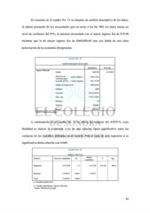 En resumen en el cuadro No. 12 se muestra un análisis descriptivo de los datos, el salario promedio de los encuestados gira en torno a los $6, 900, los datos tienen un nivel de confianza del 95%, la persona encuestada con el menor ingreso fue de $18.00 mientras que la de mayor ingreso fue de $400,000.00 esto nos habla de una clara polarización de la economía obregonense. Cuadro No. 12 Análisis descriptivo de los datos Estadístico Error típ. Ingreso Mensual Media 6685.00 64.56822 Intervalo de Límite inferior 6764.1678 confianza para la media al 95% Límite superior 7017.2749 Media recortada al 5% 4850.5844 Mediana 3600 Varianza 295342428.8 Desv. típ. 17185.52963 Mínimo 18 Máximo 400000 Rango 399982 Fuente: Elaboración propia. A continuación en el cuadro No. 13 se ofrece un resumen del ANOVA, cuya finalidad es indicar la existencia o no de una relación lineal significativa entre las varianzas de las variables utilizadas en el modelo. Para el caso de esta regresión si es significativa dicha relación con 0.000. Cuadro No. 13 Análisis ANOVAb Modelo 1 Suma de cuadrados Gl Media F Sig. cuadrática Regresión 8.413E10 13 6.471E9 419.263 .000 a. Residual 2.568E11 16636 1.543E7 Total 3.409E11 16649 a. Variables predictorias b. Variable dependiente: Ingreso Mensual. Fuente: Elaboración propia. 62