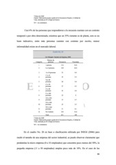 */Datos de 2008 Fuente: Elaboración propia a partir de la Encuesta de Empleo y Calidad de Vida, realizada por El Colegio de Sonora NC = no contestaron. Casi 6% de las personas que respondieron a la encuesta cuentan con un contrato temporal o por obra determinada, mientras que un 35% restante es de planta, esto es un buen indicativo, entre más personas cuenten con contrato por escrito, menor informalidad existe en el mercado laboral. Cuadro No. 20 Cd. Obregón: Tamaño de Empresa, 2008. Número de Categoría personas Frecuencia Porcentaje 1 1 persona 116 18.4 2 2 a 5 personas 129 20.4 3 6 a 10 personas 53 8.4 11 a 15 4 personas 35 5.5 16 a 20 5 personas 28 4.4 21 a 30 6 personas 27 4.3 31 a 50 7 personas 23 3.6 51 a 100 8 personas 25 4 101 a 250 9 personas 17 2.7 251 a 500 10 personas 22 3.5 501 y más 11 personas 51 8.1 12 No Contesto 105 16.6 Total 631 100 */Datos de 2008 Fuente: Elaboración propia a partir de la Encuesta de Empleo y Calidad de Vida, realizada por El Colegio de Sonora NC = no contestaron. En el cuadro No. 20 en base a clasificación utilizada por INEGI (2004) para medir el tamaño de una empresa del sector industrial, se puede observar claramente que predomina la micro empresa (0 a 10 empleados) que concentra poco menos del 50%, la pequeña empresa (11 a 50 empleados) emplea poco más de 18%. En el caso de las 66
