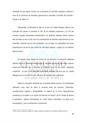 nominales de una región crezcan con su potencial de mercado constituye evidencia a favor de la existencia de elementos aglomerativos asociados al tamaño del mercado.” (Tirado et al. 2006, 57). Traduciendo y aterrizando la idea en el caso de Ciudad Obregón cabecera del municipio de Cajeme se concentra el 18% de las unidades económicas y el 12% del personal ocupado remunerado manufacturero, las empresas deberían ofrecer salarios más elevados en base al alto nivel de concentración de industria manufacturera en este municipio, situación que no está sucediendo, y en su lugar, los trabajadores del sector manufacturero son de los que reciben los más bajos salarios y cargan con un ambiente laboral incierto. En segundo lugar, aunque las teorías de concentración y localización industrial afirman que es la industria manufacturera la actividad económica que ofrece mejores condiciones laborales que le permiten al trabajador gozar de una mayor estabilidad 1 económica , en base a los hallazgos encontrados podemos aseverar que en Ciudad Obregón son los servicios los que ofrecen en su mayoría estas condiciones. Según los resultados obtenidos por el presente trabajo gracias a la metodología utilizando como base de datos la encuesta parte del proyecto “Desarrollo, reconfiguración regional y desigualdades: el impacto de la nueva especialización económica en el empleo y los niveles de bienestar de Sonora” de El Colegio de Sonora se plantearon algunas interrogantes, las cuales fueron contestadas a lo largo de la investigación, y que a continuación se mencionan. 1 Debido a que son empresas que cuentan con ventajas competitivas y comparativas ya expuestas en párrafos anteriores. 88