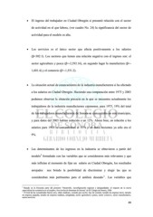 El ingreso del trabajador en Ciudad Obregón si presentó relación con el sector de actividad en el que labora, (ver cuadro No. 24) la significancia del sector de actividad para el modelo es alta. Los servicios es el único sector que afecta positivamente a los salarios (β=302.1). Los sectores que tienen una relación negativa con el ingreso son: el sector agricultura y pesca (β=-2,392.16), en segundo lugar la manufactura (β=- 1,601.4) y el comercio (β=-1,551.2). La situación actual de estancamiento de la industria manufacturera si ha afectado a los salarios en Ciudad Obregón. Haciendo una comparación entre 1975 y 2003 podemos observar la situación precaria en la que se encuentra actualmente los trabajadores de la industria manufacturera cajemense, para 1975, 19% del total de los trabajadores manufactureros de Sonora se concentraba en este municipio, y para datos del 2003 habían reducido a un 12%. Ahora bien, en relación a los salarios para 1975 se concentraban el 17% y en datos recientes ya sólo era el 9%. Las determinantes de los ingresos en la industria se obtuvieron a partir del 2 modelo formulado con las variables que se consideraron más relevantes y que más influían al momento de fijar un salario en Ciudad Obregón, los resultados arrojados nos brindo la posibilidad de discriminar y elegir las que se 3 consideraban más pertinentes para el análisis deseado . Las variables que 2 Basado en la Encuesta parte del proyecto “Desarrollo, reconfiguración regional y desigualdades: el impacto de la nueva especialización económica en el empleo y los niveles de bienestar de Sonora” de El Colegio de Sonora, 2008. 3 El total de las consideradas fueron sexo, edad, sindicato, contrato por escrito, tipo de contrato, tamaño de empresa micro, tamaño de empresa pequeña, tamaño de empresa mediana, antigüedad, sector agricultura y pesca, sector comercio, sector manufacturero, sector servicios. 89
