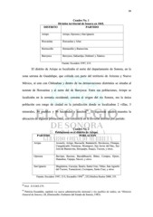 38 Cuadro No. 1 División territorial de Sonora en 1842. DISTRITO PARTIDO Arizpe Arizpe, Oposura y San Ignacio Horcasitas Horcasitas y Altar Hermosillo Hermosillo y Buenavista Baroyeca Baroyeca, Sahuaripa, Ostimuri y Álamos. Fuente: Escudero 1997, 215. El distrito de Arizpe se localizaba al norte del departamento de Sonora, en la zona serrana de Guadalupe, que colinda con parte del territorio de Arizona y Nuevo México, al este con Chihuahua y dentro de las demarcaciones distritales se situaba al noreste de Horcasitas y al norte del de Baroyeca. Entre sus poblaciones, Arizpe se localizaba en la serranía occidental, cercana al origen del río Sonora, era la única población con rango de ciudad en la jurisdicción donde se localizaban 2 villas, 5 96 minerales, 34 pueblos y 96 haciendas y ranchos . El siguiente cuadro muestra la ubicación de algunas poblaciones, con referencia en la división distrital por partido: Cuadro No. 2 Poblaciones en el distrito de Arizpe. PARTIDO POBLACION Arizpe Aconchi, Arizpe, Bacoachi, Banámichi, Baviácora, Chinapa, Cuaquiácarhi, Fronteras, Montepori, San Javier del Bac, San José de Buenavista, Sinoquipe, Suaqui, Tucson, y otros. Oposura Bavispe, Bacerac, Bacadéhuachi, Bátuc, Cumpas, Oputo, Huásabas, Tepupa, Nácori, y otros. San Ignacio Magdalena, Cucurpe, Ímuris, Santa Cruz, Túbac, San Agustín del Tucson, Tumacácori, Cocóspera, Santa Cruz, y otros. Fuente: Escudero 1997, 215; Escandón 1996 , 252;Medina Bustos 2008, 351. 97 96 Ibid. 215:263-275. 97 Patricia Escandón, capitulo La nueva administración misional y los pueblos de indios, en “Historia General de Sonora, t.II, (Hermosillo: Gobierno del Estado de Sonora, 1985).