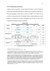 42 III.2.1 Población general de Sonora. Según las Noticias Estadísticas... de José Agustín de Escudero, en 1842 el Distrito de Arizpe tenía 33,000 habitantes, Baroyeca 30,000 y entre los distritos de Hermosillo y Horcasitas albergaban 74,000, dando un total de 137,000 100 . Para efectos de este contexto se proporcionará sólo la descripción física de algunas poblaciones de cada distrito y la estimación de su número de habitantes entre los años de 1828 a 1850, utilizando información de esa época y posteriores. Cuadro No.6 Habitantes en las principales poblaciones de Sonora 1822-1845 101 Distrito Población 1822 1828 1840 1850 102 Arizpe 2, 079 1,491 ARIZPE Villa de Oposura 2,534 2,534 2,447 Hermosillo 5,000 13,655 11,635 HERMOSILLO Puerto San José y Villa San Fernando de Guaymas Menor a 100 3,354 Villa de Horcasitas 2,460 5,964 HORCASITAS Ures Menor a 2,000 3,767 Mineral de Baroyeca 2,460 7, 484 BAROYECA Álamos 5,000 a 7,000 11, 163 Fuente: Velasco 1985, 53-61; Aguilar 1850. 100 Escudero, “Noticias estadísticas de Sonora…”, 194. 101 José de Aguilar, Memoria en que el gobierno del estado libre de Sonora, da cuenta de los ramos de su administración al congreso del mismo estado, con arreglo en lo dispuesto en el artículo 27 de la constitución. (Ures, Imprenta del gobierno a cargo de Jesús. P. Siquiros 1850), Anexo número 2. Aguilar presenta una población total de 147,133 habitantes para Sonora, con una división territorial en 9 partidos. En el caso de la ciudad de Arizpe, En el distrito de Hermosillo, se estima también una población de 3,503 habitantes de para Pueblo de Seris; en el distrito de Horcasitas, la cifra de la Villa de Oposura es junto a sus adyacentes, la concentración de Guadalupe, cercana a Ures, presentó 1,243 habitantes; en el distrito de Baroyeca, para Álamos se agrupa la cifra estimada para el mineral de Minas Nuevas, 102 Según José Agustín de Escudero, la ciudad de Arizpe es “un curato que comprende a San José de Chinapa, Real Huepavárachi, y haciendas de Bacanuchi y Tetuachi, por lo que es probable que la cifra proporcionada por Velasco corresponda en conjunto a las poblaciones citadas, en Escudero, “Noticias estadísticas de Sonora…”, 191.