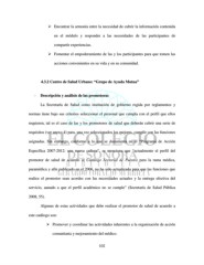 Encontrar la armonía entre la necesidad de cubrir la información contenida en el módulo y responder a las necesidades de las participantes de compartir experiencias. Fomentar el empoderamiento de las y los participantes para que tomen las acciones convenientes en su vida y en su comunidad. 4.3.2 Centro de Salud Urbano: “Grupo de Ayuda Mutua” - Descripción y análisis de las promotoras La Secretaría de Salud como institución de gobierno regida por reglamentos y normas tiene bajo sus criterios seleccionar el personal que cumpla con el perfil que ellos requieren, tal es el caso de las y los promotores de salud que deberán cubrir una serie de requisitos (ver anexo 4) para, una vez seleccionados los mejores, cumplir con las funciones asignadas. Sin embargo, conforme a lo que se documenta en el “Programa de Acción Específica 2007-2012: una nueva cultura”, se menciona que “actualmente el perfil del promotor de salud de acuerdo al Catálogo Sectorial de Puestos para la rama médica, paramédica y afín publicado en el 2006, no ha sido actualizado para que las funciones que realice el promotor sean acordes con las necesidades actuales y la entrega efectiva del servicio, aunado a que el perfil académico no se cumple” (Secretaría de Salud Pública 2008, 55). Algunas de estas actividades que debe realizar el promotor de salud de acuerdo a este catálogo son: Promover y coordinar las actividades inherentes a la organización de acción comunitaria y mejoramiento del médico. 102