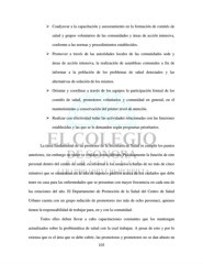 Coadyuvar a la capacitación y asesoramiento en la formación de comités de salud y grupos voluntarios de las comunidades y áreas de acción intensiva, conforme a las normas y procedimientos establecidos. Promover a través de las autoridades locales de las comunidades sede y áreas de acción intensiva, la realización de asambleas comunales a fin de informar a la población de los problemas de salud detectados y las alternativas de solución de los mismos. Orientar y coordinar a través de los equipos la participación formal de los comités de salud, promotores voluntarios y comunidad en general, en el mantenimiento y conservación del primer nivel de atención. Realizar con efectividad todas las actividades relacionadas con las funciones establecidas y las que se le demanden según programas prioritarios. La tarea fundamental de un promotor de la Secretaría de Salud es cumplir los puntos anteriores, sin embargo no todos se realizan como debiera. Prácticamente la función de este personal dentro del centro de salud, es informar a los usuarios (charlas de no más de cinco minutos) que se encuentran en la sala de espera o pasillos acerca de los cuidados que debe tener en casa para las enfermedades que se presentan con mayor frecuencia en cada una de las estaciones del año. El Departamento de Promoción de la Salud del Centro de Salud Urbano cuenta con un grupo reducido de promotores (no más de ocho personas), quienes tienen la responsabilidad de trabajar para, en y con la comunidad. Todos ellos deben llevar a cabo capacitaciones constantes que los mantengan actualizados sobre la problemática de salud con la cual trabajan. A pesar de esto y por lo extensa que es el área que se debe cubrir, las promotoras y promotores no se dan abasto en 103