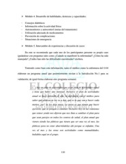 Módulo 4. Desarrollo de habilidades, destrezas y capacidades: - Consejos diabéticos - Información sobre la actividad física - Automonitoreo y autocontrol (metas del tratamiento) - Utilización adecuada de medicamentos - Prevención de complicaciones - Situaciones de emergencia Módulo 5. Intercambio de experiencias y discusión de casos: En este se recomienda que cada uno de los participantes presente su propio caso (guiándose con preguntas tales como ¿Cuándo se manifestó la enfermedad? ¿Cómo ha sido manejada? ¿Cuáles han sido las dificultades encontradas? etcétera. Teniendo como base esta información, tanto el médico como la enfermera del GAM elaboran un programa anual que posteriormente envían a la Jurisdicción No.1 para su validación; de igual forma elaboran otro programa semanal. (…) hay un plan de actividades que es un plan de actividades anual y tiene que haber uno mensual. Inclusive el plan de actividades anual se hace entrando el año, la enfermera con el médico para saber qué pláticas se les va a dar, qué es lo que van a hacer cada martes ¿no? Se les deja tarea. La tarea es que tienen que hacer ejercicio, que se pongan a caminar. Inclusive hoy en las reuniones que estuve yendo nos dijeron que nos iban a cambiar el plan para que sean parejos en todos los centros de salud, el plan anual que vienen siendo las pláticas que tienen que ser una vez al mes, las pláticas para no estar aburriéndolas ahí porque se enfadan. Una vez al mes y las otras son actividades como manualidades, bailables aquí en el grupo. 110