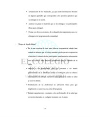 Actualización de los materiales, ya que existe información obsoleta en algunos apartados que corresponden a los ejercicios prácticos que se entregan en la sesión. Analizar en grupo el material que se les entrega a los participantes (hojas para entregar). Contar con diversos registros de evaluación de seguimiento para ver el impacto del programa en la comunidad. - “Grupo de Ayuda Mutua” En lo que respecta al GAM hace falta un programa de trabajo (aun cuando se informa que sí lo hay) semanal, por lo que no se aprovecha al máximo la estancia de las participantes para brindarles información que las ayude a tener mejores herramientas para el cuidado de su salud. Motivar a las participantes para que soliciten a los demás profesionales de la salud que asistan al GAM para que les ofrezca información con enfoque preventivo para aprender a cuidar su salud y la de los demás. Contratación de un profesional en activación física para que implemente y supervise esta parte del programa. Brindar capacitaciones constantes a los profesionales de la salud que se ven involucrados en cualquier momento con el grupo. 124